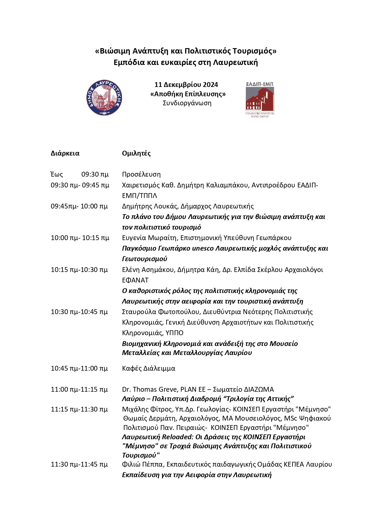 Lavrion Technological Cultural Park), σε συνεργασία με τον Δήμο Λαυρεωτικής, διοργάνωσαν ημερίδα την Τετάρτη 11 Δεκεμβρίου 2024, με θέμα «Βιώσιμη ανάπτυξη και Πολιτιστικός Τουρισμός: Εμπόδια και ευκαιρίες στη Λαυρεωτική».
